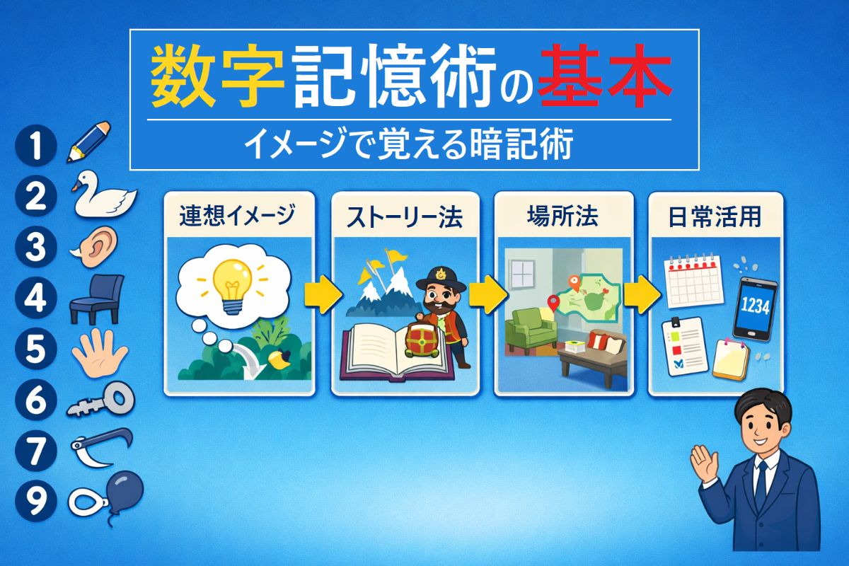 記憶術 数字 イメージとは、数字を直感的なイメージや映像に変換し、記憶力を高める方法です。この手法は古代から存在し、古代ギリシャの「記憶の宮殿」やペグ法などに起源を持つとされています。数字とイメージを結びつけることで、抽象的な情報が具体的な記憶として脳に残りやすくなります。現代では、学習や試験対策、仕事の効率化だけでなく、子供の数字学習や資格取得にも広く利用されています。特に語呂合わせやイメージ変換表を活用することで、数字の羅列も短時間で覚えやすくなりました。
